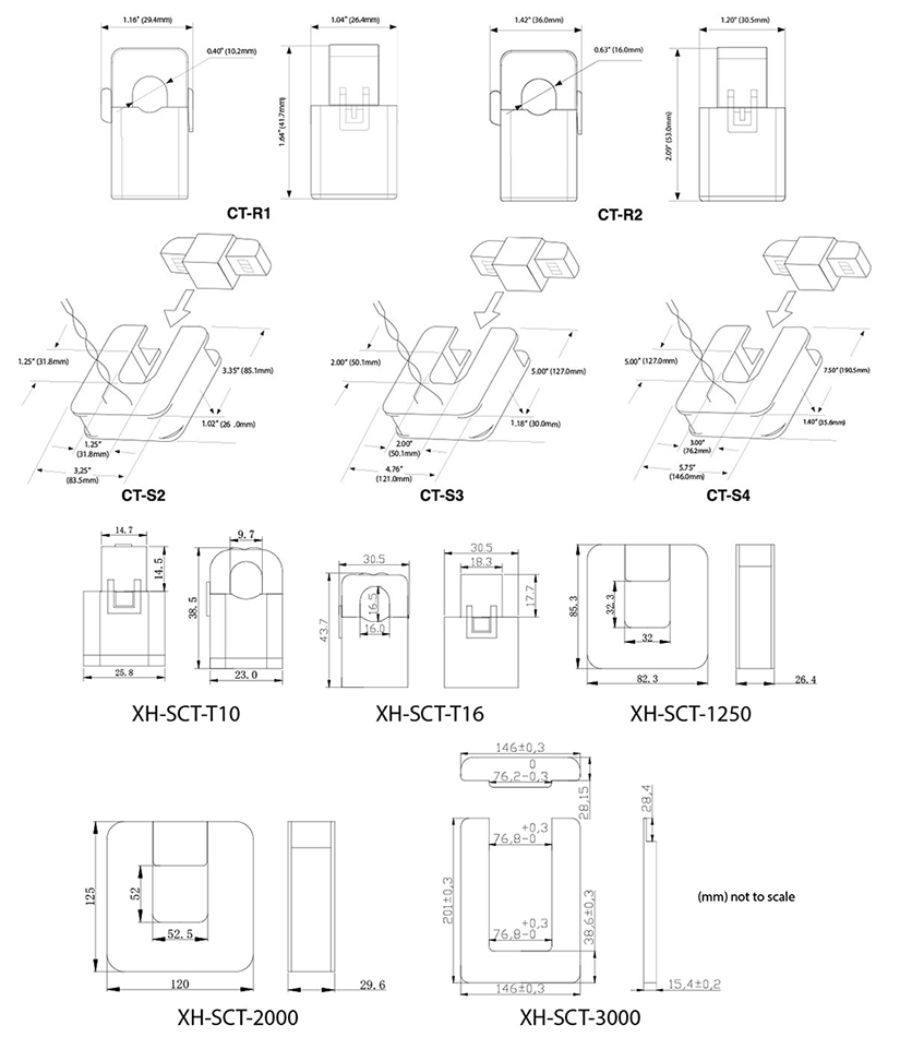 Choose from 5 aperture sizes Each outputs 0.333V (333mV) at rated current Sense loads 15-3000A CT’s come in a range of inner diameter sizes and amperages